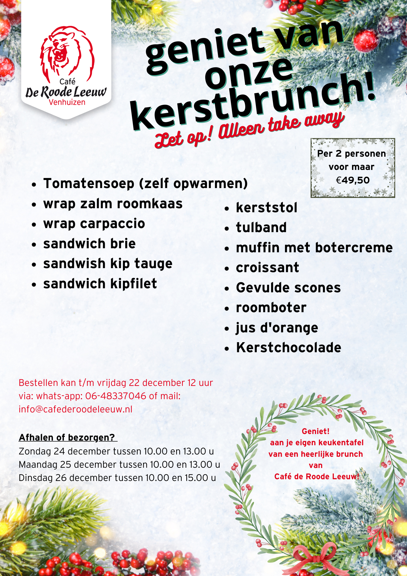 Geniet aan je eigen keukentafel van een heerlijke kerstbrunch. Onze kerstbrunch is per 2 personen te bestellen voor maar 49,50. De kerstbrunch bestaat uit heerlijke wraps en sandwiches, kerststol, tulband, croissant, jus d'orange en nog veel meer lekkers! Bestellen kan tot vrijdag 22 december 12.00 uur via info@cafederoodeleeuw.nl of tel. 06-20607005. Afhalen of bezorgen? Bel of whats-app ons even om een tijd af te stemmen.