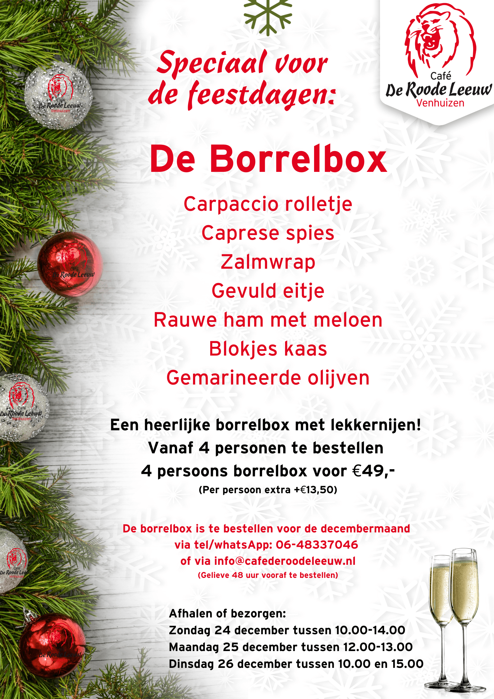 Bestel nu een heerlijke borrelbox met lekkernijen! Speciaal voor de feestdagen of gewoon tijdens de decembermaand bij een borrel! Onze borrelbox is vanaf 4 personen te bestellen voor 49,-. (Per persoon extra +13,50. Onze borrelbox is de gehele decembermaand te bestellen en af te halen. Gelieve 48 uur vooraf te bestellen via tel. 06-20607005.