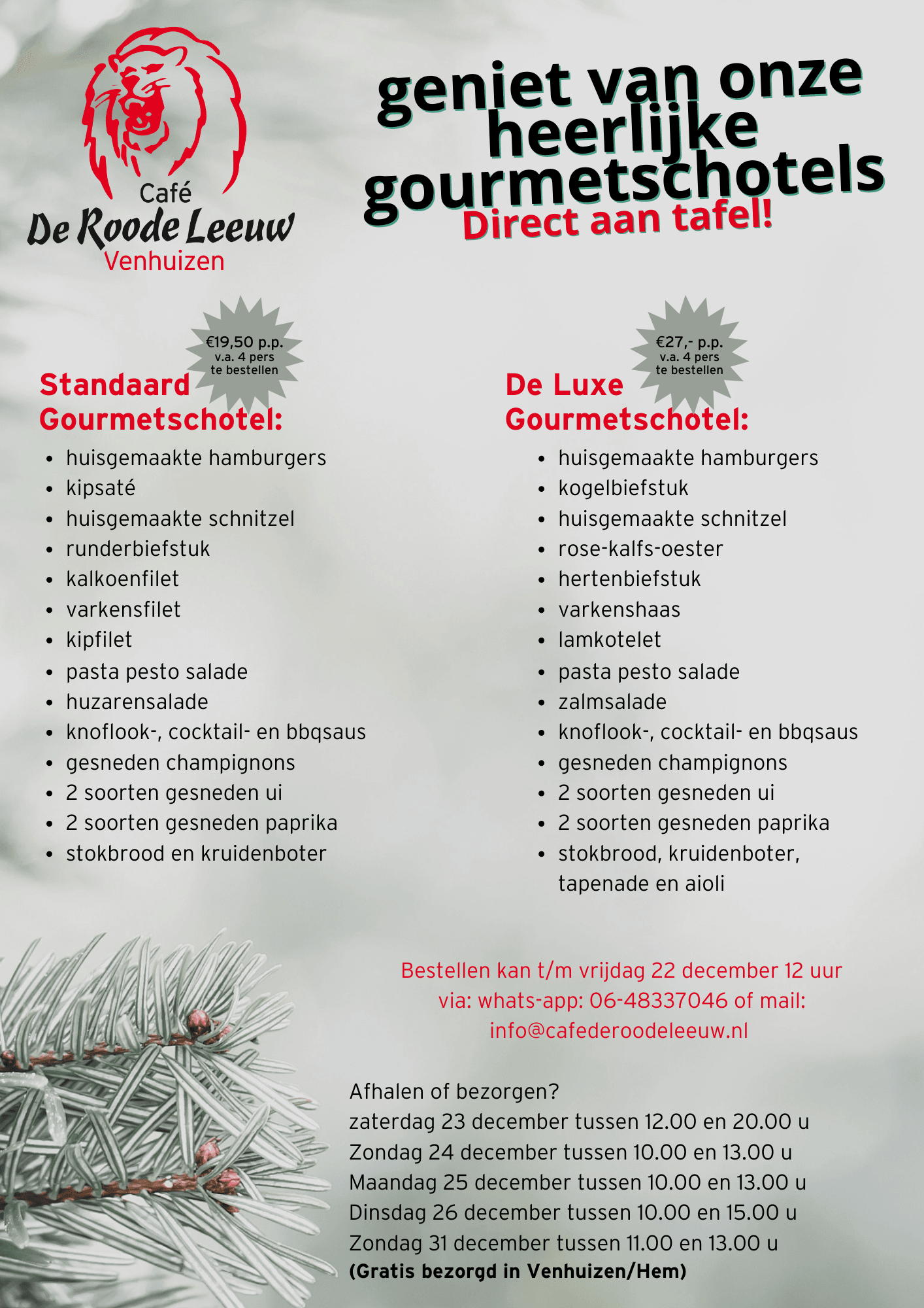 Direct aan tafel met onze heerlijke samengestelde gourmetschotels! Niet alleen het vlees zullen wij verzorgen, maar deze "All inn" schotels zijn voorzien van salades, sauzen, groentes en stokbrood met kruidenboter. Je hebt keuze uit een "standaard gourmetschotel of een De Luxe gourmetschotel" Beide schotels zijn vanaf 4 personen te bestellen. Bestellen kan tot vrijdag 22 december 12.00 uur via info@cafederoodeleeuw.nl of tel. 06-20607005. Afhalen of bezorgen? Bel of whats-app ons even om een tijd af te stemmen.