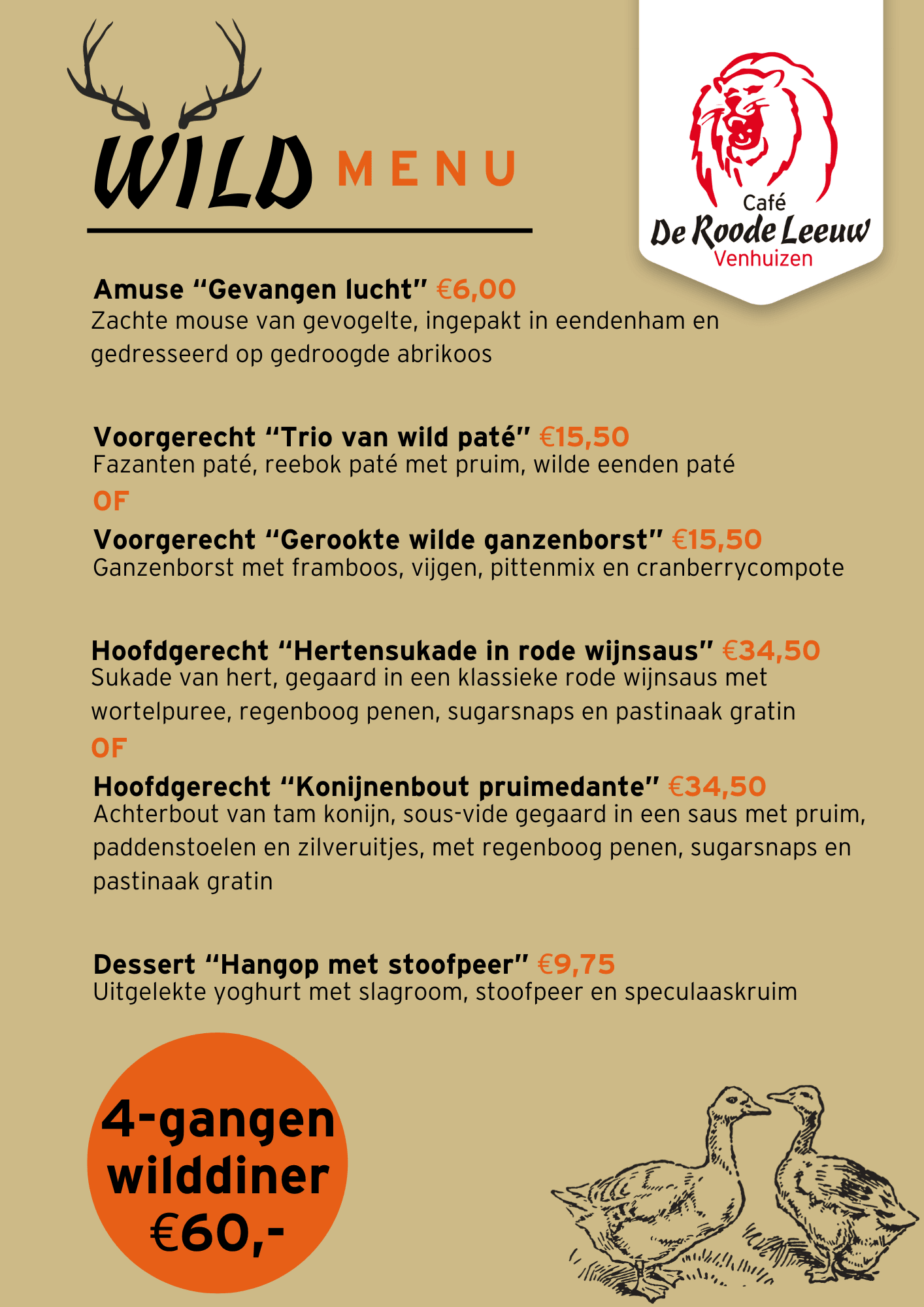 Reserveer dan nu je tafel en laat je lekker verwennen! Naast onze á la carte dinerkaart hebben wij ook een heerlijk "Wild-menu". Ook dat is mogelijk op 2e kerstdag. Geef het even aan bij je reservering.